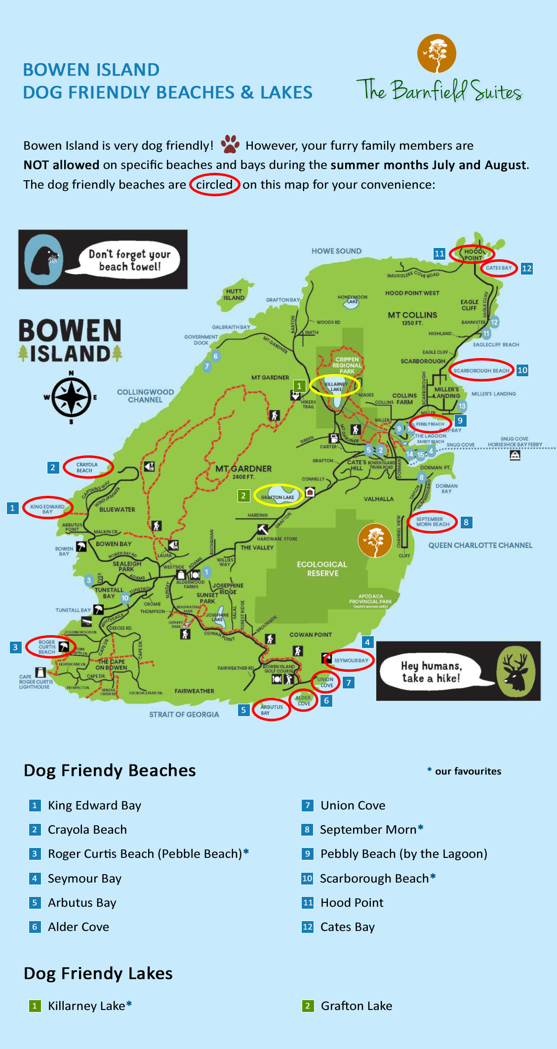 As we mentioned, Bowen Island is a very pet friendly and dog friendly island throughout the year. However, there are several beaches and bays that are NOT dog friendly during July and August. These restrictions are enforced between July 1st and August 31st of every year.