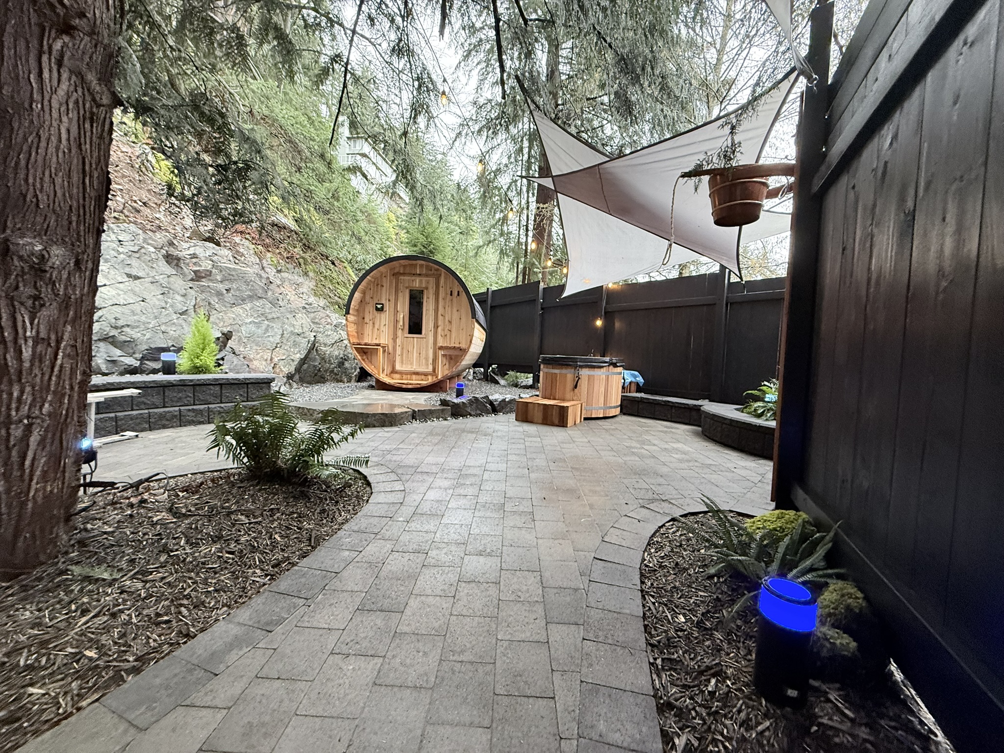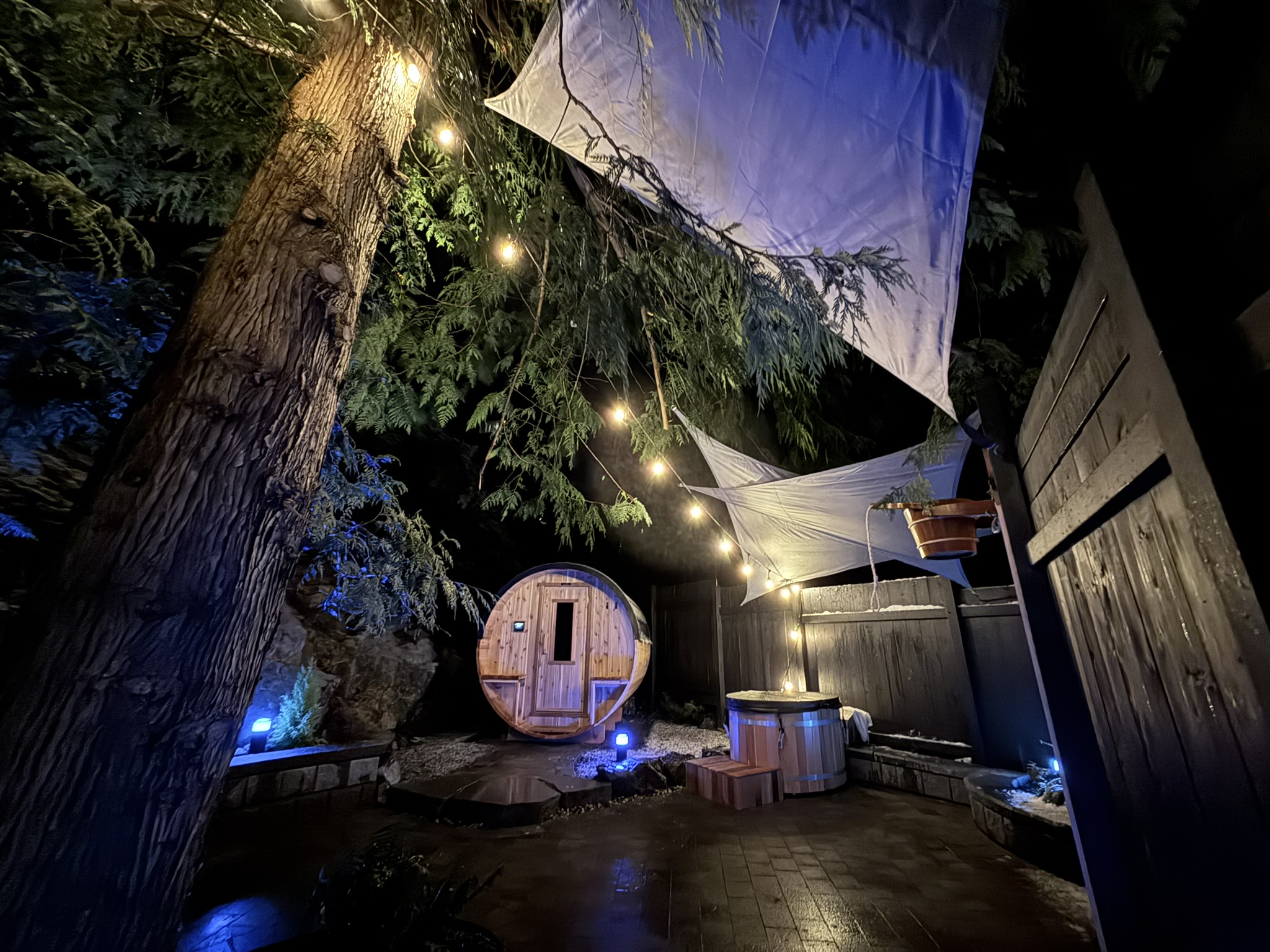 Family-friendly Bowen Island sauna with custom Philips Hue light shows for kids at Cedarwood Elements.