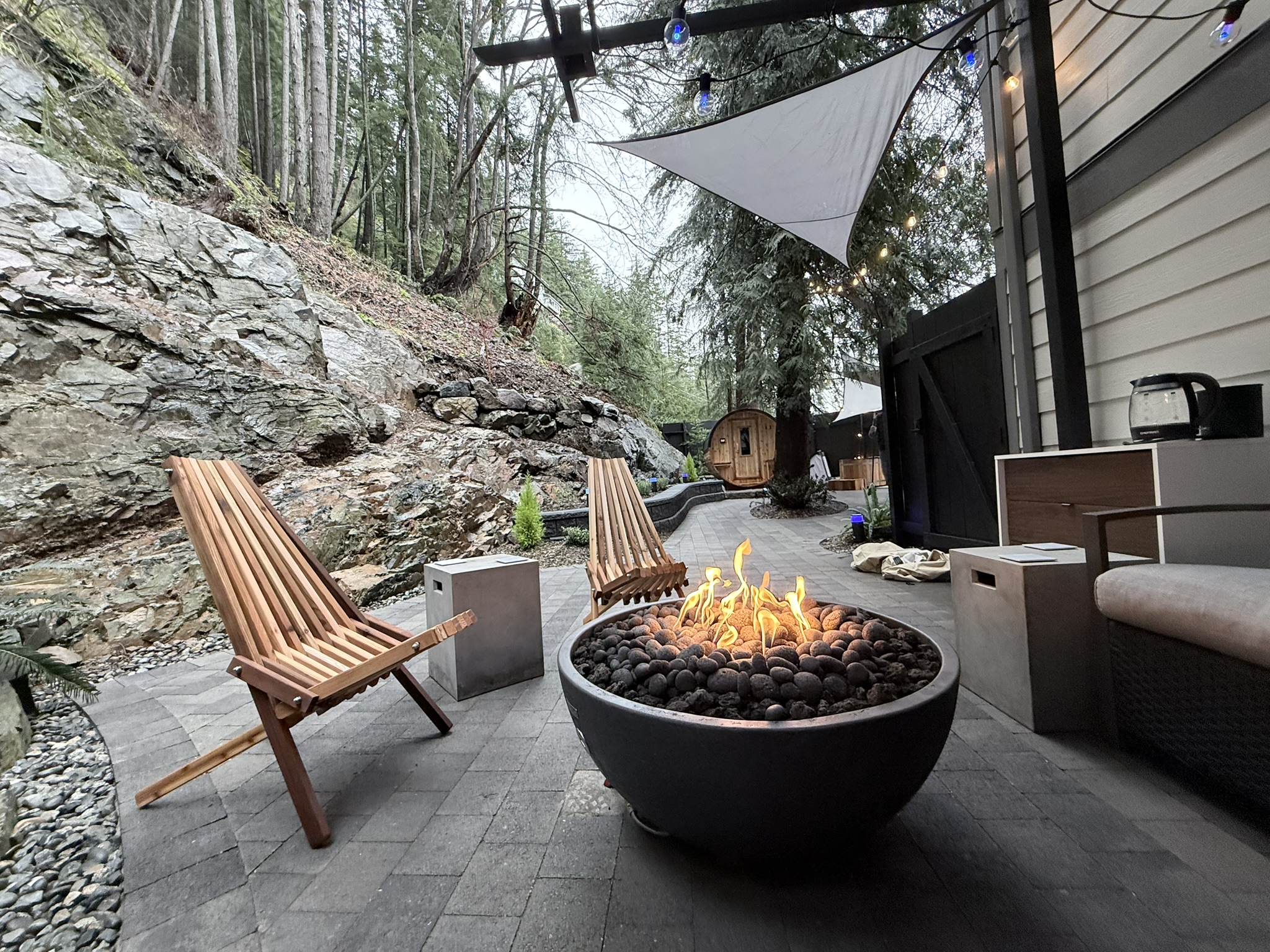 Location is everything. Our Bowen Island sauna  is not hidden in a basement; it is an architectural feature of the landscape. Bordering a granite cliff that forms the natural rear wall of our sanctuary, the sauna sits beneath a canopy of old-growth trees. Directly above the cliff is a protected ecological reserve, ensuring that the only sounds you hear are the wind in the boughs and the local birds. This biophilic connection to the island is essential for the “Earth” and “Air” components of our journeys.