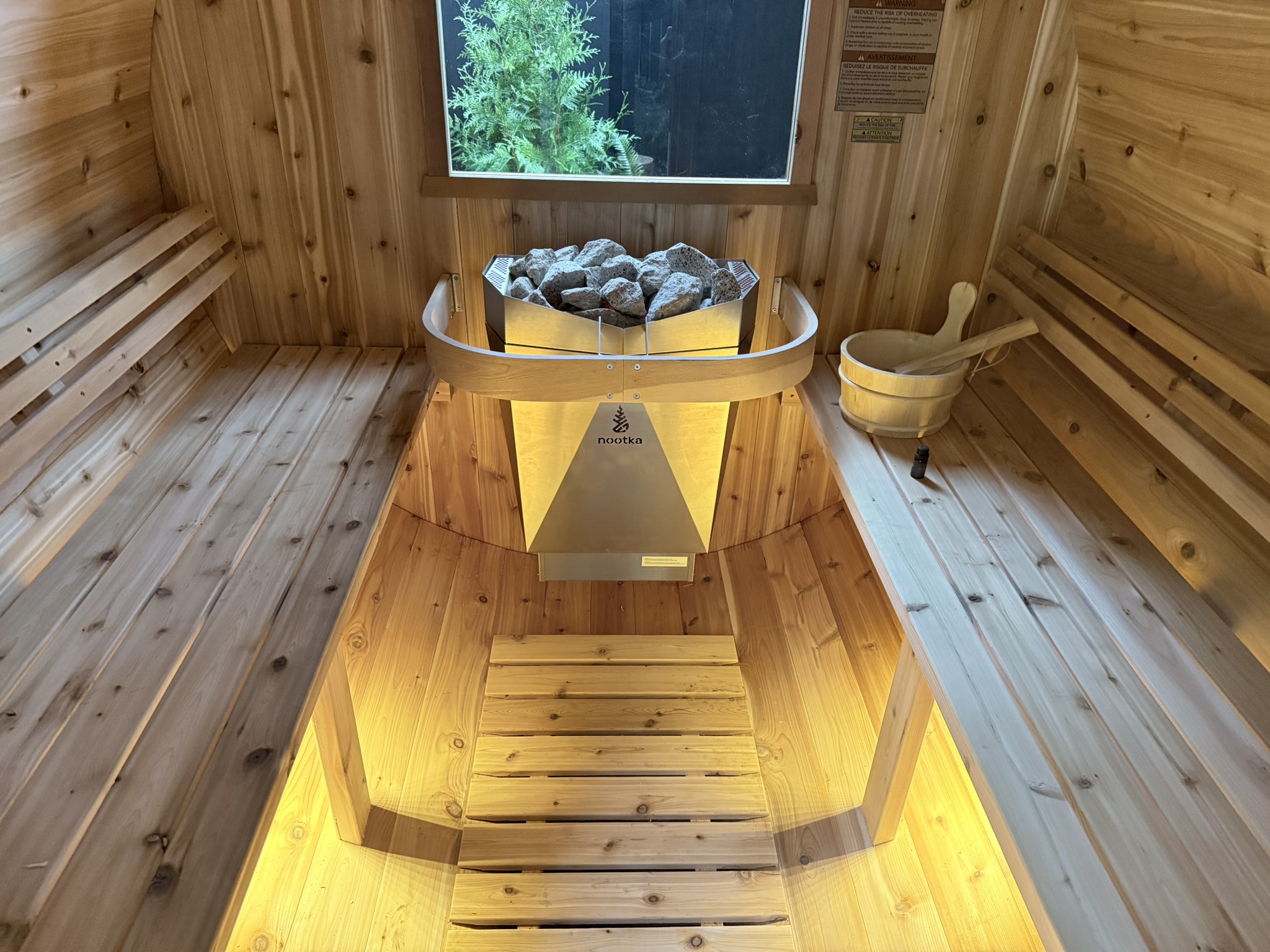 Cedar is the “King of Woods” for a reason. Specifically, Western Red Cedar contains natural oils that are anti-fungal and anti-bacterial—critical for a hygienic, high-traffic sauna environment. Beyond hygiene, the aromatic compounds released by hot cedar, such as  cedrol, have been scientifically linked to decreased heart rate and improved nervous system regulation. Our Nootka sauna features custom cedar backrests and flooring, ensuring that every inch of your skin is in contact with this therapeutic timber.